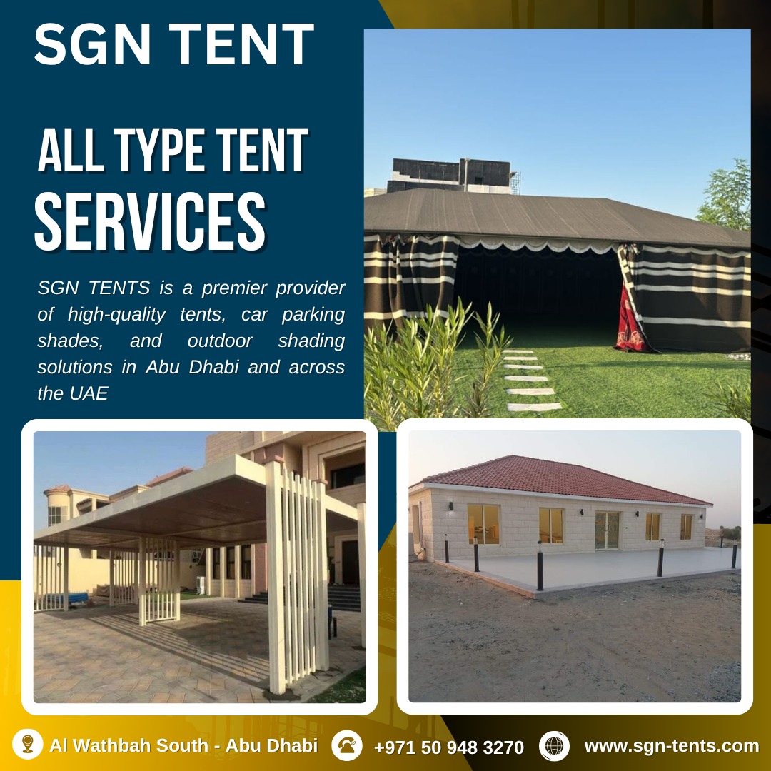 SGN TENTS is a premier provider of high-quality tents, car parking shades, and outdoor shading solutions in Abu Dhabi and across the UAE. With years of experience in designing, manufacturing, and installing a wide range of outdoor structures, we have become a trusted name in the industry. Our products include car parking shades, fabric tensile shades, swimming pool sail shades, retractable and fixed awnings, pergolas, school and playground shades, and much more.